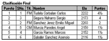 MF Carlos Tudela acabó invicto atesorando casi la totalidad de los puntos (4,5) tan sólo cediendo unas tablas ante el segundo clasificado, el flamante fichaje del CAC Beniaján para esta temporada, Sergio Segura, quien ha demostrado estar en un excelente estado de forma. Sumando un total de 4 puntos, también ha terminado invicto. Tercera posición para el otro jugador del CAC en liza, MF Emilio Sánchez.