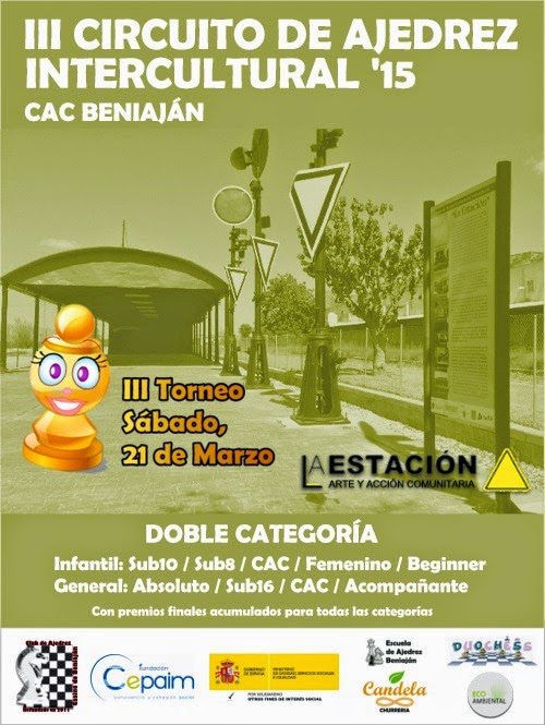 Tercera cita del Circuito de Ajedrez Intercultural 2015, que tendrá lugar el próximo Sábado 21 de Marzo a partir de las 16:30h.