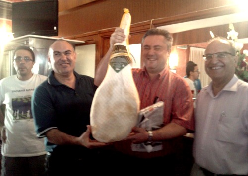 El premiado Mateos recibiendo el jamón de manos de Mateo (vicepresidente) junto a Leandro (presidente) y, al fondo, Benito (capitán-delegado) con cara de pensar «adiós al pernil»
