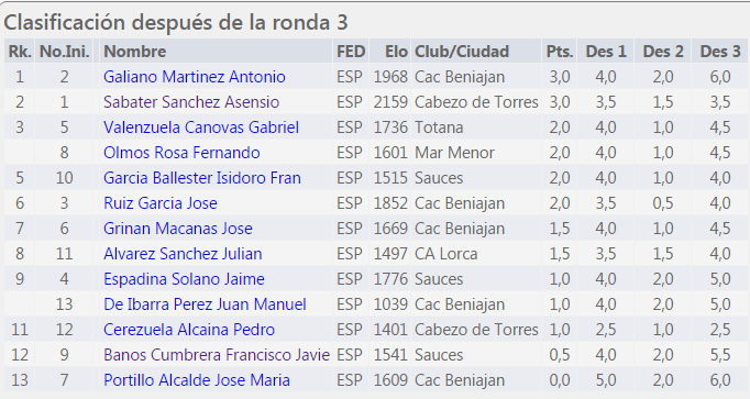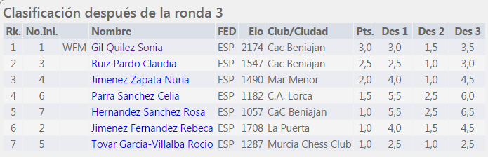 Tras las tres primeras rondas, Sonia está en cabeza de la clasificación con 3 puntos de los 3 posibles, Claudia está en segunda posición con 2,5 puntos y Rosa que de momento lleva un punto.