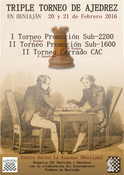 Los días 20 y 21 de Febrero tendrá lugar en Beniaján un triple torneo de ajedrez: