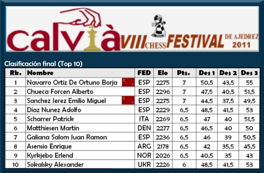 Dos de los mejores jugadores murcianos en activo se embarcaban, durante toda la semana pasada, en la octava edición del Festival Internacional de Ajedrez de Calviá, una pequeña localidad mallorquina situada a muy poca distancia de Palma de Mallorca (Baleares). Hablamos del ex de Vistabella, Borja Navarro (2275), y del MF Emilio Sánchez Jerez (2275), miembro del CAC Beniaján y C.A. Api de Elche.