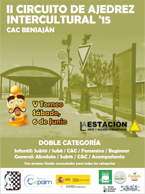 Después de los cuatro encuentros en la Estación de Beniaján, anunciamos que el II Circuito de Ajedrez de Beniaján toca a su fin el próximo Sábado, 6 de Junio a partir, como de costumbre de las 16:30 h. (hora de inicio de la primera ronda).