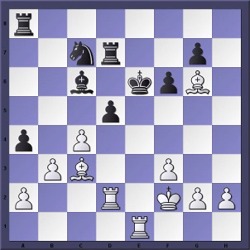 La variante Rauser (antidragón) de la Siciliana abrió fuego en la mesa 1, donde el dueño de las blancas pronto obtuvo ventaja de un peón. La presión de las torres sobre otro peón negro débil obligó al acercamiento del rey a esa zona para intentar ayudar en tareas defensivas, algo que le costó la partida como se puede observar en el diagrama en el que, después de Te1+, el jugador visitante abandonaba antes del inminente mate con …, Rd6 (única); Ab4#.